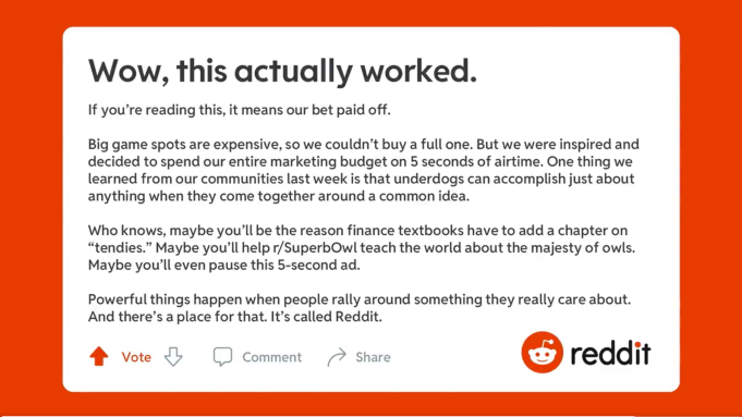 Superbowl Reddit Commercial / Gw4mxoyujb33um - .super bowl 2021 live stream online without what channel is the super bowl on this year cbs will broadcast this years super bowl with jim nantz and tony romo twitter.. The reddit logo took over tv screens on super bowl sunday after a commercial that seemed to (also popular on reddit last week: Reddit has aired its first super bowl spot though you might have missed it while reaching for a snack. Pause it if you can read it. The superbowl community, where people mused on superb owls.) When people come together in front of something they care about, powerful things happen.